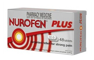 Nurofen plus Main use:Mild to moderate pain Active ingredient:Ibuprofen 200mg, codeine phosphate 12.8mg Manufacturer:Reckitt Benckiser