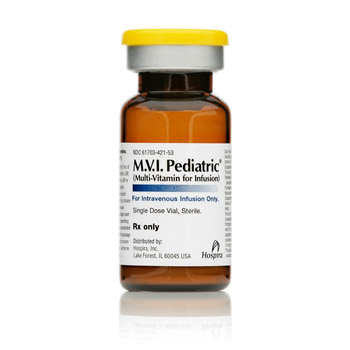 Additional information about Infuvite Pediatric Infuvite Pediatric Indication: For treatment of pernicious anemia (due to lack of or inhibition of intrinsic factor) and for prevention and treatment of vitamin B 12 deficiency. Mechanism Of Action: Vitamin B12 is used in the body in two forms: Methylcobalamin and 5-deoxyadenosyl cobalamin. The enzyme methionine synthase needs methylcobalamin as a cofactor. This enzyme is involved in the conversion of the amino acid homocysteine into methionine. Methionine in turn is required for DNA methylation. 5-Deoxyadenosyl cobalamin is a cofactor needed by the enzyme that converts L-methylmalonyl-CoA to succinyl-CoA. This conversion is an important step in the extraction of energy from proteins and fats. Furthermore, succinyl CoA is necessary for the production of hemoglobin, the substances that carries oxygen in red blood cells. Drug Interactions: Not Available Food Interactions: Not Available Generic Name: Cyanocobalamin Synonyms: Vitamin B12; Vitamin B12 complex; Cyanocob(III)alamin Drug Category: Antianemic Agents; Essential Vitamin; Vitamins (Vitamin B Complex) Drug Type: Small Molecule; Nutraceutical; Approved Other Brand Names containing Cyanocobalamin: Cyomin; Dicopac; Nascobal; Rubramin PC; Anacobin; Bedoz; Berocca PN; Berubigen; Betalin 12; Cernevit-12; Cobavite; Cobex; Cobolin-M; Crystamine; Crysti-12; Cyanocobalamin Co 57 Schilling Test Kit; Cyanoject; Depinar; Dicopac Kit; Infuvite Pediatric; M.V.I. Pediatric; Neuroforte-R; Primabalt; Redisol; Rubivite; Rubratope-57 Kit; Rubratope-60 Kit; Ruvite; Shovite; Vi-Twel; Vibal; Vibisone; Vitabee 12; Vitaped; Absorption: Readily absorbed in the lower half of the ileum. Toxicity (Overdose): Anaphylactic reaction (skin rash, itching, wheezing)-after parenteral administration. ORL-MUS LD50 > 8000 mg/kg Protein Binding: Very high (to specific plasma proteins called transcobalamins); binding of hydroxocobalamin is slightly higher than cyanocobalamin. Biotransformation: Hepatic Half Life: Approximately 6 days (400 days in the liver). Dosage Forms of Infuvite Pediatric: Liquid Intramuscular Solution Intramuscular Capsule Oral Powder Oral Liquid Oral Tablet Oral Tablet, extended release Oral Chemical IUPAC Name: Not Available Chemical Formula: C63H89CoN14O14P+ Organisms Affected: Humans and other mammals