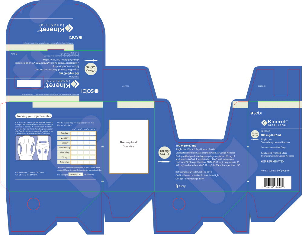 Kineret® is supplied in single use prefilled glass syringes with 27 gauge needles as a sterile, clear, colorless-to-white, preservative-free solution for daily subcutaneous (SC) administration. Each prefilled glass syringe contains: 0.67 mL (100 mg) of anakinra in a solution (pH 6.5) containing sodium citrate (1.29 mg), sodium chloride (5.48 mg), disodium EDTA (0.12 mg), and polysorbate 80 (0.70 mg) in Water for Injection, USP.