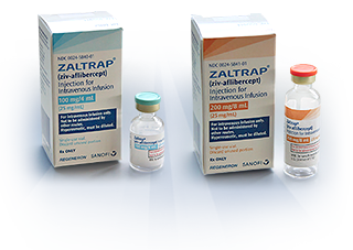 适应证和用途 ZALTRAP,与5-氟尿嘧啶[5-fluorouracil],甲酰四氢叶酸,伊立替康[irinotecan]- (FOLFIRI)联用,适用于对含奥沙利铂方案耐药或已进展的转移结肠癌(mCRC)患者。 剂量和给药方法 4 mg/kg,每2周,历时1小时静脉输注。 不给静脉(IV)推注或丸注给药。 剂型和规格 单次使用小瓶:100 mg/4 mL (25 mg/mL),200 mg/8 mL (25 mg/mL) 禁忌证 无 警告和注意事项 ZALTRAP临床试验曾见到不良反应,有时严重和危及生命或致命,包括: (1)瘘管形成:如发生瘘管终止ZALTRAP。 (2)高血压:监测血压和治疗高血压。如高血压不能控制暂时暂停ZALTRAP。如发生高血压危象终止ZALTRAP。 (3)动脉血栓事件(ATE) (如,短暂性缺血发作,脑血管意外,心绞痛):如发生ATE终止ZALTRAP。 (4)蛋白尿:监测尿蛋白。当蛋白尿 ≥ 2 g/24小时,暂停ZALTRAP。如果发生肾病综合征或血栓性微血管病(TMA) 终止ZALTRAP。 (5)中性粒细胞减少和中性粒细胞减少并发症:延迟ZALTRAP/FOLFIRI给药直至中性粒细胞计数是≥ 1.5 x 109/L。(6)腹泻和脱水:严重腹泻和脱水的发生率增加。更严密监视老年患者。 (7)可逆性后部白质脑病综合征(RPLS):终止ZALTRAP。 不良反应 最常见不良反应(所有级别,≥20% 发生率和对ZALTRAP/FOLFIRI方案发生率至少大于2%)是白细胞减少,腹泻,中性粒细胞减少,蛋白尿,AST增加,口腔炎,疲乏,血小板减少,ALT增加,高血压,体重减轻,食欲减退,鼻衄,腹痛,发声困难,血清肌酐增加,和头痛。