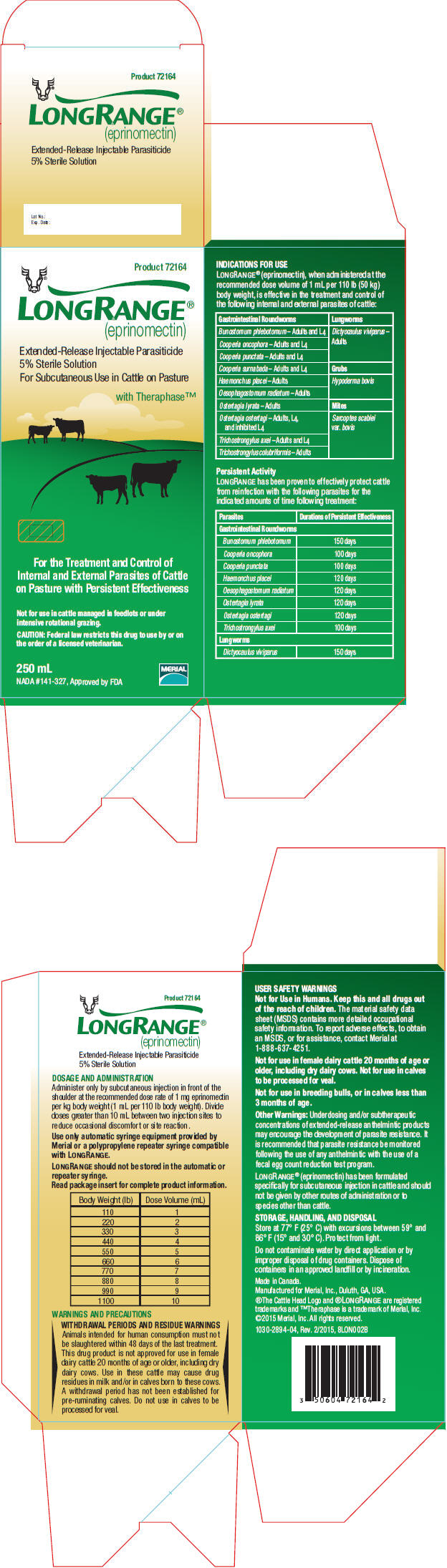 LONGRANGE (eprinomectin) should be given only by subcutaneous injection in front of the shoulder at the recommended dosage level of 1 mg eprinomectin per kg body weight (1 mL per 110 lb body weight).